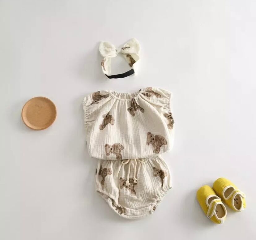 可愛い新生児服❤️くま柄夏服❤️ノースリーブandブルマandヘアバンド 3ピース❤️入荷!